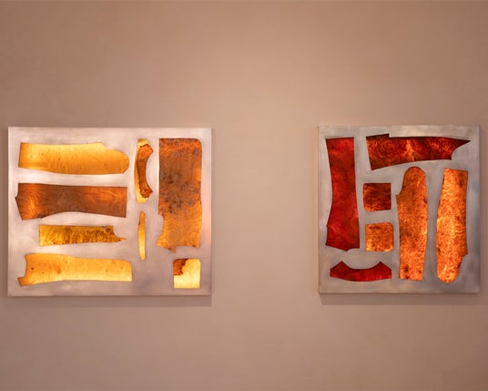 アルミニウム製の壁掛けパネル。バックライトで照らされたバールウッドは、服の型紙の形にカットされています。