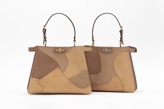 ルイス・ケメノエにより再解釈された「ピーカブー ソフト」 ミディアムは、フェンディの職人たちによるジャケットパターンに沿ってカットされたレザーを組み合わせ、彼の作品を特徴づけるパッチワークを表現しています。「アエニグマ」コレクション全体に使われているティンバーが内部の構造を形成し、家具に使われている二つの特徴的な金属に合わせてシルバーと真鍮製のネジが用いられるなど、メタルパーツがつながりを深めています。「ピーカブー ソフト」バッグを開くと、中から隠れた木材のテクスチャーが姿を現します。