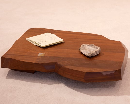 サペリ材の厚板。手作業で削った端を持ち、連結されたダブル「FF」ロゴモチーフがかみ合うボックスジョイントでつなぎ合わせています。