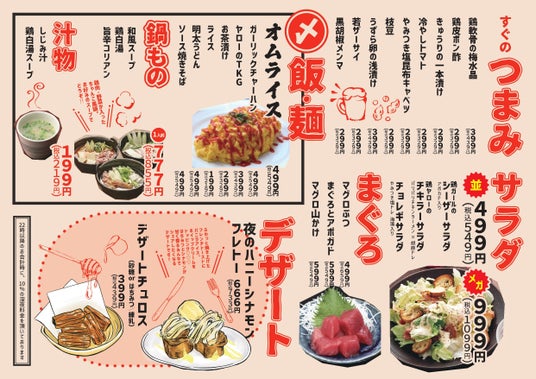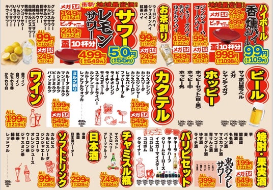 50円のレモンサワーを筆頭に、サワーやハイボールが99円という信じられないような価格。新感覚の居酒屋が北海道、青森八戸、静岡、名古屋栄と金山に上陸!ついに100店舗の大台も見えてきた!