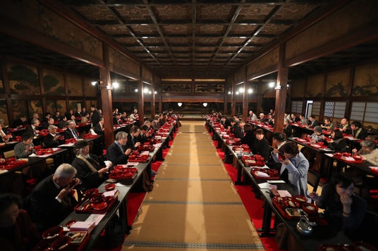 西本願寺では、1月9日から16日まで行われる御正忌報恩講法要(ごしょうきほうおんこうほうよう)の期間、通常非公開の国宝 書院「鴻之間」(こうのま)にて、お斎(とき)を召しあがっていただくことができます。