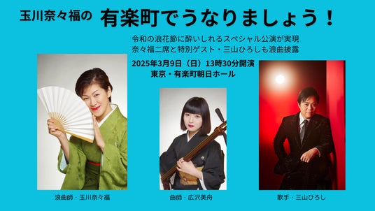 株式会社朝日新聞社(代表取締役社長:角田克)は、2025年3月9日(日)に有楽町朝日ホール(東京都千代田区有楽町2-5-1 有楽町マリオン11F)で「玉川奈々福の有楽町でうなりましょう!~三山ひろし浪曲披露~」を開催します。初めて人間国宝も誕生した浪曲の魅力を再発見する特別公演。女性の演者が主役となる国際女性デー企画の一環として、和製ミュージカルとも言われる伝統の世界をアップデートする玉川奈々福がファンタジー創作「金魚夢幻」など二席。NHK紅白歌合戦連続出場を続ける歌手・三山ひろしも特別ゲストとして登場し、浪曲をうなります。三味線を弾く曲師は気鋭の広沢美舟。浪曲初体験の方にも足を運んで頂けるように、40歳以下の方を対象にU40優待指定席のチケットも発売します。