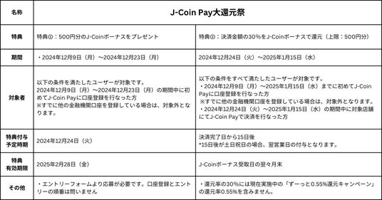 株式会社みずほ銀行が提供するスマホコード決済サービス「J-Coin Pay」は、2024年12月9日(月)より、「J-Coin Pay大還元祭」を実施します。