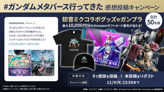 ガンダムメタバースの期間限定オープンを記念し、感想を投稿することで初音ミクコラボグッズやガンプラ、最大10,000円分のAmazonギフトカード番号など、豪華賞品が当たるキャンペーンを実施中です。