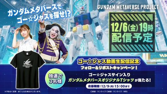 ガンダムメタバースの期間限定オープンを記念し、ゲーム実況バラエティチャンネル「ゴー☆ジャス動画」(YouTube)での生配信を、12月6日(金)19:00~実施予定です。