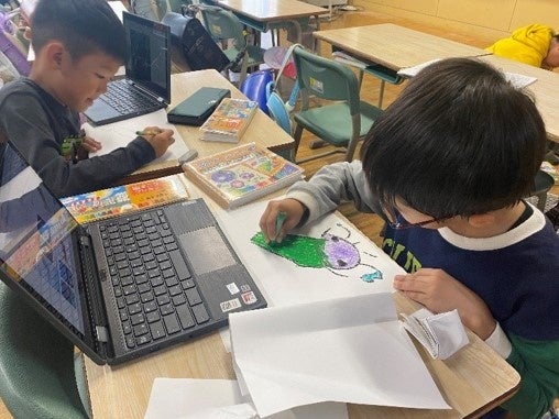 ・「未来の海には、こんな色のお魚がいるかもしれないと思って描いています」(資生館小学校2年生)