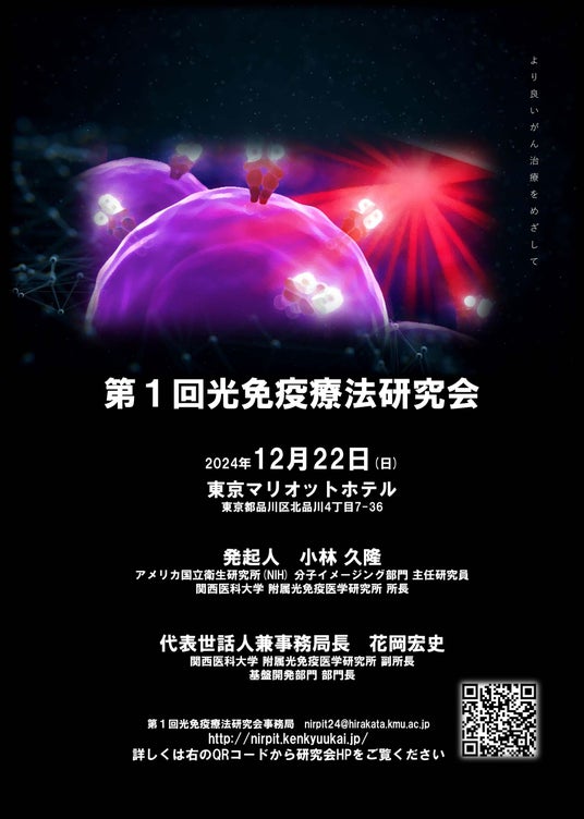 2024年12月22日(日)、東京マリオットホテル(品川区)にて、新しいがん治療である光免疫療法の最前線を紹介する「第1回光免疫療法研究会」が開催されます。この研究会では、光免疫療法に関する最新の研究・開発や臨床の治療成果などが発表され、がん光免疫療法に興味のある研究者や診療に携わる医師が一堂に会して情報交換致します。また、忖度をできるだけ排除して自由闊達な議論を行える純粋なアカデミックの会とするために、企業の協賛なしで行います。