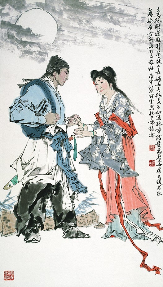 范曽《新婚別》中国の詩人である杜甫の社会詩の代表作とされる「新婚別」の詩を題材とした作品で、画中には詩の一部が添えられています。結婚してすぐに夫を戦争へ送り出す妻の悲しみが表現された本作には、今まさに別れの時を迎える夫婦が描かれています。夫に向ける妻のやわらかくも寂しげなまなざしが印象的な作品です。