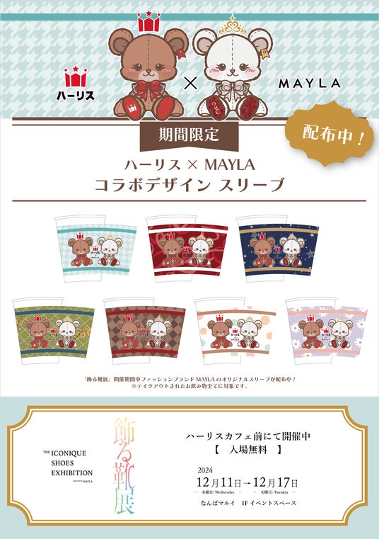 展示期間中は、同施設内の大人気カフェ「ハーリス」との特別コラボが実現。MAYLAがデザインしたオリジナルスリーブのドリンクを楽しみながら、展示会の余韻を味わえます。MAYLA描き下ろしハーリスベアーとMAYLAのプリンセスベアがペアになった特別なデザインにご注目!