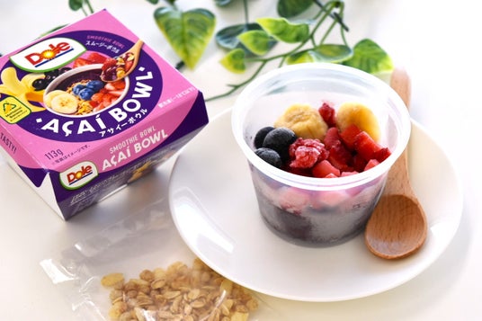『Doleスムージーボウル アサイー』は、ブルーベリー・いちご・バナナの冷凍フルーツ3種とスムージーベースを、カップに盛り付けました。お召し上がりの際はカップのまま室温で約30分自然解凍するか、電子レンジで30秒(注:600wの場合)温め、別添えのグラノーラをトッピングするだけで、手軽にお楽しみいただけます。