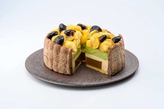 既に定評のある小布施堂の和菓子。栗餡のおいしさを洋菓子でも味わってもらいたいと、今回はじめて本格的なケーキの開発に取り組みました。ビスキュイで覆われたシャルロットケーキには、滑らかな口当たりの栗のムース、抹茶のムースと栗餡を重ね、さらにその内にアクセントの栗羊羹を忍ばせました。贅沢にトッピングした大粒の岸根栗と花豆(信州産)が食感のインパクトを与える、様々な味わいが折り重なった仕上がり。クリスマスやお正月など特別な時に楽しみたい、思う存分和栗のおいしさが楽しめるスペシャルケーキです。
