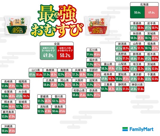 12月3日から好評販売中の「最強どん兵衛 きつねむすび」と「最強どん兵衛 かき揚げむすび」について、県別の販売個数に違いがあるのか調査いたしました。全国平均では「きつね」49.8%、「かき揚げ」50.2%とやや「かき揚げ」がリードしております。県別に見ると東日本と西日本で分かれる興味深い結果となりました!また、「きつね派」No.1は熊本県(53.4%)、「かき揚げ派」No.1は山梨県(52.5%)でした。みなさんの地元の県はどのような結果になったのか、ぜひ楽しみながら食べ比べをしてみてください。