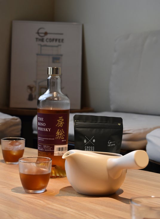 蓋なし珈琲急須”LIDLESS”と千葉県の地酒房総ウイスキーで香り付けを行った”房総ブレンドコーヒー”