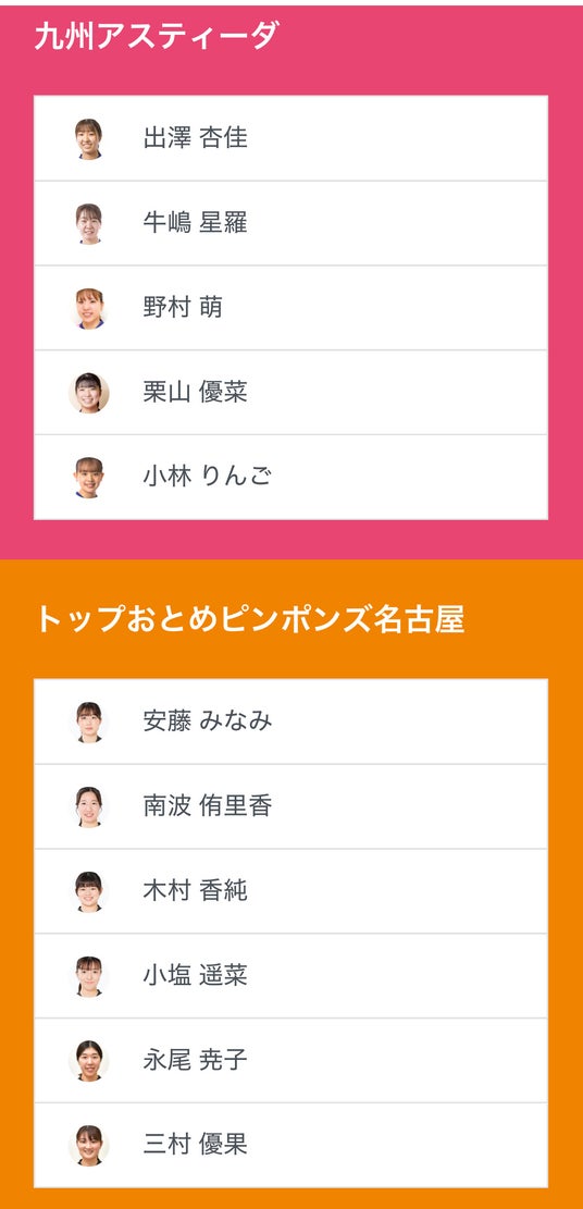 ノジマTリーグ 2024-2025シーズン 公式戦 12月13日開催 九州アスティーダ vs トップおとめピンポンズ名古屋のベンチ入り選手を発表いたします。