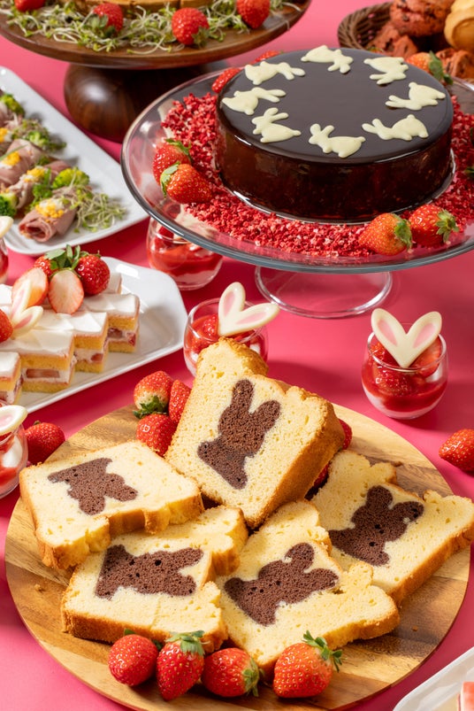 スイーツには、「女峰 ストロベリーショートケーキ」や、「あまおう ストロベリー パリブレスト」のほか、フレッシュないちごをたっぷりと添えるクレームダンジュなど、旬のいちごの魅力が詰まったスイーツご用意。さらに、甘酸っぱいいちごのジュレをホワイトチョコレートのムースで包み込むチョコレートムースや、フランボワーズ風味のチョコレートムースとクレームブリュレを重ねる濃厚なムースケーキなど、ベリーとチョコレートを合わせたリッチな味わいのメニューも登場いたします。また、チョコレートファウンテンでは、フレッシュないちごに、濃厚で力強いカカオ感とスパイシーさやウッディさなどのアロマが感じられるホテルのオリジナルチョコレート「Grande H」をたっぷりと絡めてご堪能いただけます。このアフタヌーンティー ブッフェでは、バレンタインやホワイトデーシーズンの恋愛運アップを祈願し、恋愛運をアップさせるラッキーアニマルとも言われる「うさぎ」のモチーフを随所にちりばめます。うさぎや“うさ耳”のチョコレート、うさぎのシルエットが可愛らしいパウンドケーキなど、目でも舌でもお楽しみいただけるスイーツが並びます。