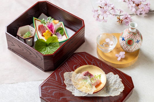 春山の味覚の味わいに合わせてペアリングを提供します。例えば、柔らかな春の苦みを感じる二の重「花烹」には、桜酵母を使った華やかな日本酒「積善 純米吟醸生酒 桜の花酵母」を合わせます。また、香ばしい香り豊かな三の重「桜炭」には、お米の味わいがしっかりとした日本酒「信州亀齢 純米酒 ひとごこち」を用意。その他の品々ともそれぞれ相性の良いお酒を合わせ、春の訪れを祝う、華やかなひとときを演出します。