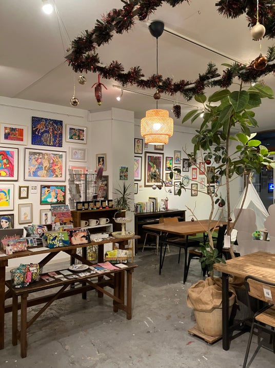 展示作品が多数飾られているカフェでアートを眺めながらゆったりとした時間を過ごせる空間になっている