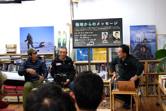 当日は、第一部として、本プロジェクトの発端となった1989年の犬ぞりによる世界初の南極大陸横断を追ったドキュメンタリー映画「Trans-Antarctica Expedition(トランスアンタークティカ エクスペディション)」を小田急電鉄江ノ島線桜ヶ丘駅前の広場で野外上映、延べ100名近くが映画を鑑賞しました。第二部は冒険研究所書店に場所を移し、事前申し込みをした25名とオンライン参加者に向けてトークイベントを開催。荻田氏と舟津氏に加え、急遽参加が決まった冒険家でノンフィクション作家の角幡唯介氏が「冒険クロストーク」を繰り広げました。荻田氏、角幡氏から舟津氏へ映画の内容や、当時についての質問、それぞれの極地での冒険などを切り口に、国際平和、環境問題、チャレンジスピリットなどについて参加者とともに考えました。