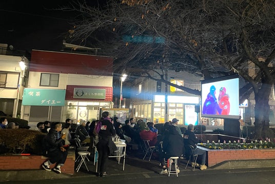 小田急電鉄江ノ島線桜ヶ丘駅前の広場でドキュメンタリー映画「Trans-Antarctica Expedition」を上映