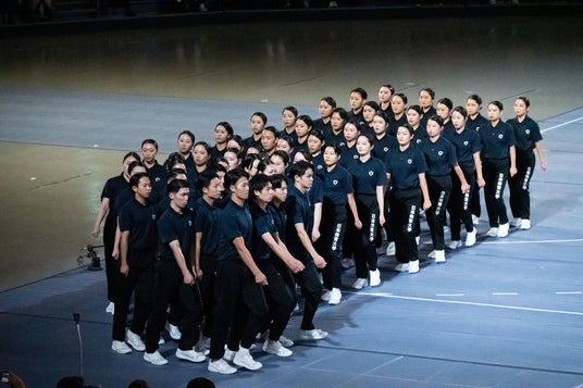 集団行動は、日本体育大学で1966年から実践されている歩行訓練の名称です。本来の目的は教育ですが、その実演の動画が2010年代初頭からYouTubeなどで拡散しはじめ、国際的な注目を集めています。毎年、有志の学生が五ヵ月間の猛練習を経て、「体育研究発表実演会」で実演を披露。今年は11月26日に横浜アリーナで開催され、約70名による一糸乱れぬ歩行と、ときにはユーモアも交えながら描くさまざまなパターンが今回も満場の観客を驚かせました。