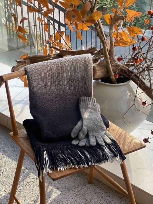白から墨色へのグラデーションに染めたショールは、冬の雪の夜をイメージしたデザインです。後染めだからこそできる繊細なグラデーションは、白の配分を少し多めに、羽織った時に片側の肩にかかる部分がグラデーションになる様に配しています。