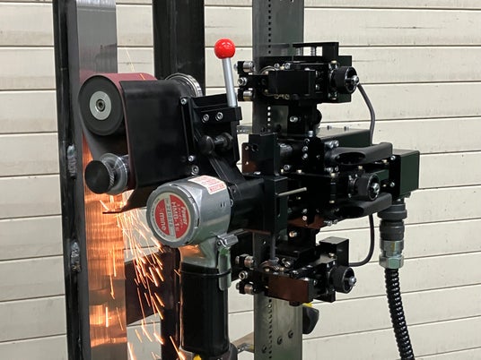 溶接によって接合された金属の盛り上がり部分である「溶接ビード」を自動で研削する装置。現在、溶接ビードの除去は、ほぼ手作業により行われているが、本製品を用いることで、自動で粗研磨を終了できる。研磨に要した人員を他の行程に回せるので、製造効率が向上し、人手不足の解消にも役立つ。
