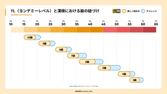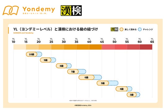 子どもが読書にハマるオンライン習い事「ヨンデミー」を運営する株式会社Yondemy(本社:東京都中央区、代表取締役:笹沼 颯太)は、公益財団法人 日本漢字能力検定協会(京都市東山区、代表理事 理事長:山崎信夫)と協力し、ヨンデミーが独自に開発した本の難易度指標「YL(R)(ヨンデミーレベル)」と「漢検の級」を紐付ける取り組みを行いました。これにより、読書を通じて触れ合える漢字・語彙レベルを具体的に把握できる、日本初の新たな指標が誕生しました。この指標を活用することで、子どもたちは、自分の漢字能力に最適な本の難易度を選ぶための参考にすることができます。