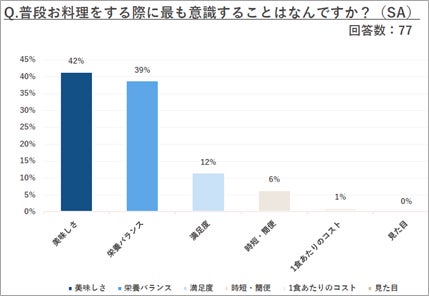 今回のモニター調査(2024年10月24日~10月31日 当社調査)では、スナップディッシュユーザーの79%が「カロパ料理に興味がある」と回答。また、普段の料理で最も意識することとして「美味しさ」(42%)、「栄養バランス」(39%)が上位を占め、カロリーを意識した食事と満足度の両立へのニーズが顕著に表れる結果となりました。