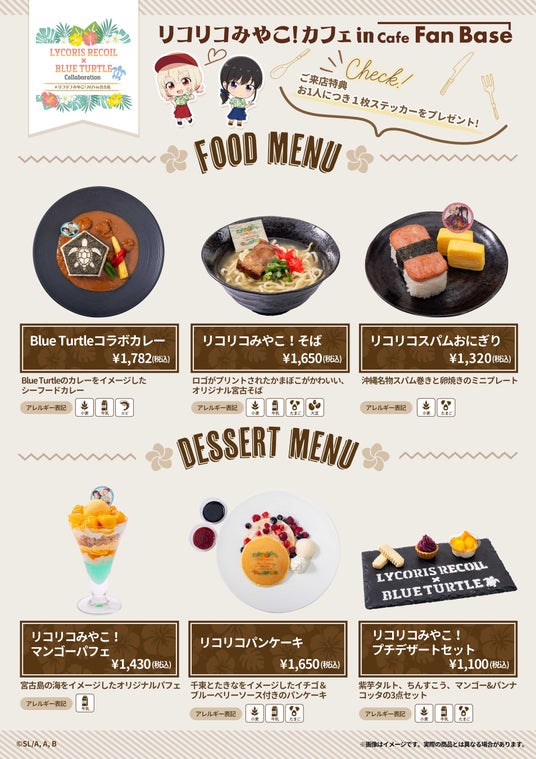 作中登場キャラクターや、聖地沖縄 宮古島・Blue Turtleをイメージしたメニュー、フード3種、デザート3種、ドリンク10種をご用意いたしました。