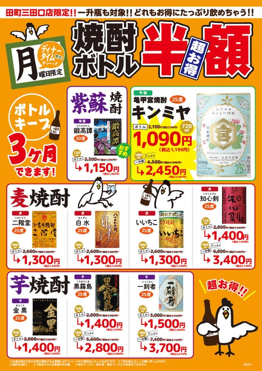 12/16(月)・12/23(月)焼酎ボトル半額で提供いたします「全国鶏行脚 ぱたぱた家」田町三田口店