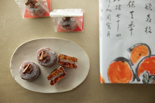 創業254年の柿菓子の老舗が手掛ける、まさに宝のような一品。岐阜県特産「堂上蜂屋柿」の干し柿を巻き、求肥をはさんでかわいらしい柿の形に仕あげました。
