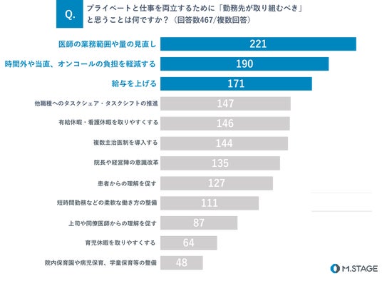 プライベートと仕事を両立するために「勤務先が取り組むべき」だと思うことについて、「医師の業務範囲や量の見直し」(221)が最も多く、次いで「時間外や当直、オンコールの負担を軽減する」(190)、「給与を上げる」(171)が続く結果となりました。