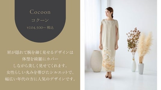 肩から袖口にかけ、柔らかいラインが特徴のコクーン。腕を出しすぎず、気品を感じさせるデザイン。女性らしい丸みを帯びたシルエットが人気です。