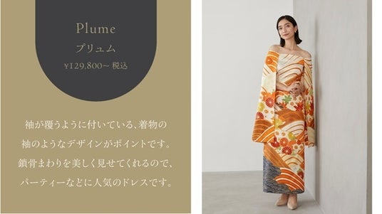 長い袖が特徴かつ着物らしさを演出するロングドレス。シンプルなラインをエレガントに見せるスリット入りの袖が特徴です。