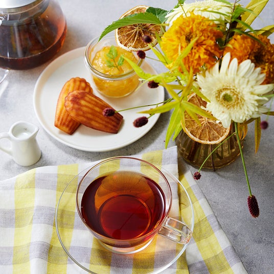 はちみつの甘い香りがカステラやマドレーヌのカラメルのような甘い香りと同調し、レモンの香りが調和して爽やかにも感じられます。紅茶のやさしい渋みは後味をほどよく洗い流して、香りの余韻を楽しめます。