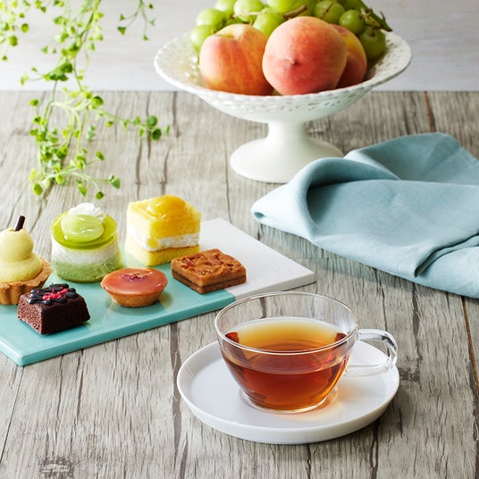 ・商品説明:アフタヌーンティーに楽しんでいただきたいご褒美スイーツのようなフレーバードティー。桃やマスカットのような爽やかで甘い香りは、生クリームを使用したケーキとのペアリングがおすすめです。