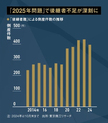 日経ビジネスの予測によると、2024年は2013年以来11年ぶりに年間倒産件数が1万件を超える見通しとなっています。経営者の高齢化と後継者不足による「後継者難」倒産も過去最多を更新する勢いとなっており、後継者が不在の企業の割合は実に62.2%にも上ります。