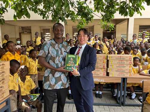 JFE商事株式会社(代表取締役社長:小林俊文)とグループ会社の川商フーズ株式会社(代表取締役社長:中村行盛)は、社会貢献活動の一環として、ナイジェリア、ガーナの学校計15校に、サバトマト漬缶詰1万2,500缶、企業ロゴ入りの学習机・椅子460セット、オリジナルデザインノート1万7,000冊を寄贈し、「食」と「教育」の支援を行いました。2011年に「GEISHAブランド誕生100周年」を契機に開始したこの活動は、今回で14回目を迎えます。