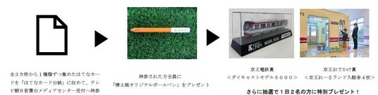 内 容:京王線沿線の3カ所(新宿駅、調布駅、若葉台駅)で配布する「宇宙にまつわる不思議や知識を記載したはてなカード」を全3種類集め、「君も博士になれる展」会場へ持参された方全員にプレゼントをご用意しています。さらに、抽選で鉄道グッズなどの賞品もプレゼントします。