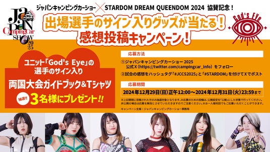 ユニット「God's Eye」の選手のサイン入り両国大会ガイドブック&Tシャツが抽選で当たる感想投稿キャンペーンを開催。「STARDOM DREAM QUEENDOM 2024」にご来場された方は、ジャパンキャンピングカーショー2025公式X(https://twitter.com/campingcar_info)をフォローして試合の感想をハッシュタグ「#JCCS2025」と「#STARDOM」を付けてX(旧Twitter)でポストしてください。