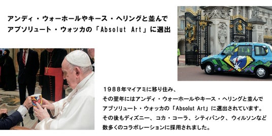 1988年にマイアミに移住し、翌年にはアンディ・ウォーホールやキース・ヘリングと並んでアブソリュート・ウォッカの「Absolut Art」に選出。その後もディズニー、コカコーラ、シティバンク、ウィルソン、さらには2010年FIFAワールドカップのオフィシャルポスターアートを手がけるなど、数多くのコラボレーションに採用されました。