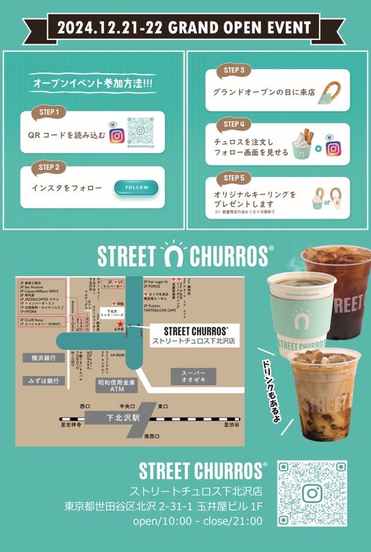 下北沢店GRAND OPENを記念して2024年12月19-20日 10:00~13:00&17:00~20:00にて、インスタをフォローで「オリジナル」または「チュロス」(4本入り)をプレゼント!