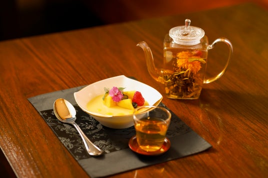 梨をふんだんに使用し、金木犀の香りを白ワインにうつした桂花陳酒が香る、贅沢な中華風パフェ。桂花陳酒のゼリー、クリーミーな杏仁豆腐、紫の菊の花のソース、梨のコンポート、ザクロ、シャインマスカット、梨とライチのシャーベット、白きくらげ等、多種多様な味わいが楽しめる逸品です。皮膚や粘膜の乾燥を潤すと言われている白きくらげを加え、見た目の美しさだけでなく、身体にも優しいスイーツです。毎回大人気の季節のパフェは、数量限定で販売しております。