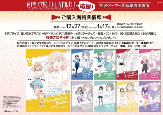 『ラブライブ!蓮ノ空女学院スクールアイドルクラブ』関連のキャラクターグッズ・書籍・CD・DVD・BDをご購入税込1,500円毎に、特典ブロマイド(全9種)をランダムで1枚プレゼント!