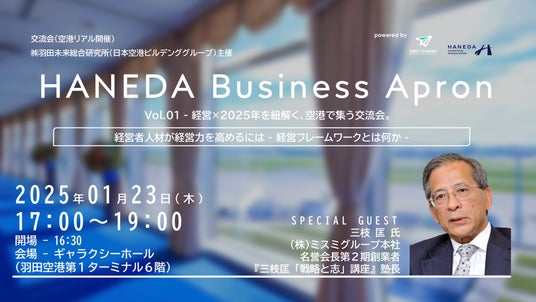 今回は、「HANEDA Business Apron vol.01 - 経営×2025年を紐解く、空港で集う交流会。』を開催テーマにし、株式会社ミスミグループ本社 名誉会長・第2期創業者であり、公開講座「三枝匡『戦略と志」講座』を主宰する三枝 匡氏を特別ゲストにお迎えし、「経営者人材が経営を高めるには‐経営フレームワークとは何か‐」をトピックとして、トークセッションを予定しております。