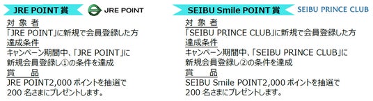 ※キャンペーンの参加にはエントリーが必要です(1回のエントリーのみで3つの賞に同時エントリー)。※「JRE POINT」と「SEIBU PRINCE CLUB」会員にどちらも新規で会員登録された場合は「JRE POINT賞」と「SEIBU Smile POINT賞」のいずれも抽選の対象となります。※ポイントプレゼントはいずれも2025年3月下旬を予定しています。※当選者の発表はポイントプレゼントをもって代えさせていただきます。