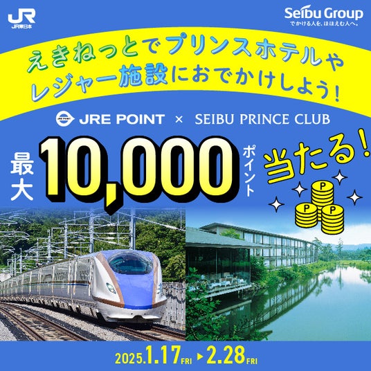 東日本旅客鉄道株式会社(本社︓東京都渋谷区、代表取締役社長︓喜㔟 陽一/以下「JR東日本」)と株式会社西武ホールディングス(本社︓東京都豊島区、代表取締役社長兼COO︓西山 隆一郎/以下「西武HD」)は、JR東日本の鉄道と、西武HDのホテルやレジャー施設等をご利用いただくことで「JRE POINT」や「SEIBU Smile POINT」が抽選で当たるキャンペーン「えきねっとでプリンスホテルやレジャー施設におでかけしよう!」を開催いたします。