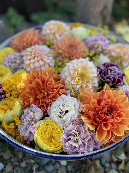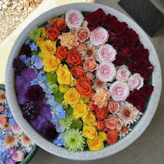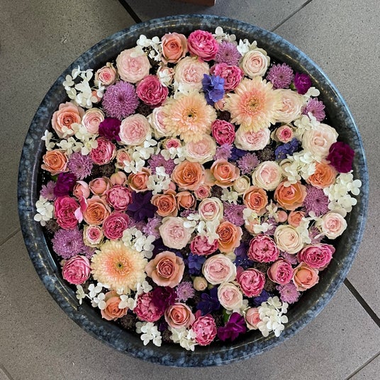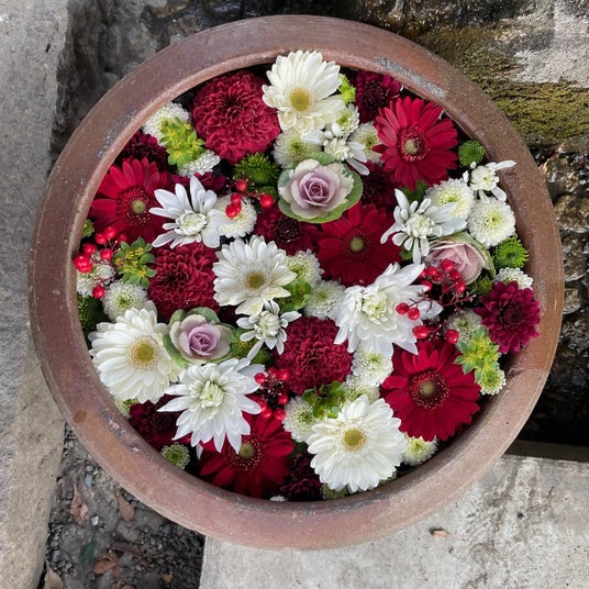 ※花手水:参拝前に手や口を清めるために設けられた寺社の手水舎(ちょうずしゃ)や、公共施設などに置いた睡蓮鉢に色とりどりの花を浮かべたもの。
