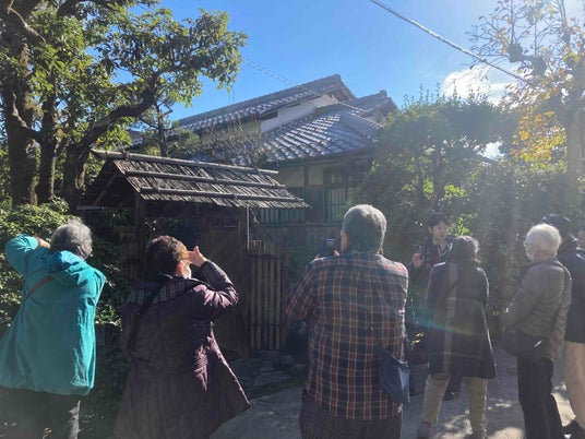 高浜虚子も過ごされた重要文化財「三三庵」の説明を受けている様子。建物の名前の由来も聞くことができました。(「三」は吉祥の数字とされているから、お酒を“ささ”と呼んでいたことから、“笹”から落ちた水がお酒になったから、など)