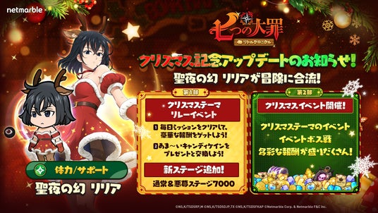 ネットマーブルは、スマートフォン向け新作スマホカジュアルRPG『七つの大罪~リトルクロニクル~』(略称:リトクロ、開発:Netmarble F&C Inc.)において、12月17(火)に、新レジェンドキャラ「聖夜の幻 リリア」の追加や新たなイベントを開催するゲームのアップデートを実施いたしました。